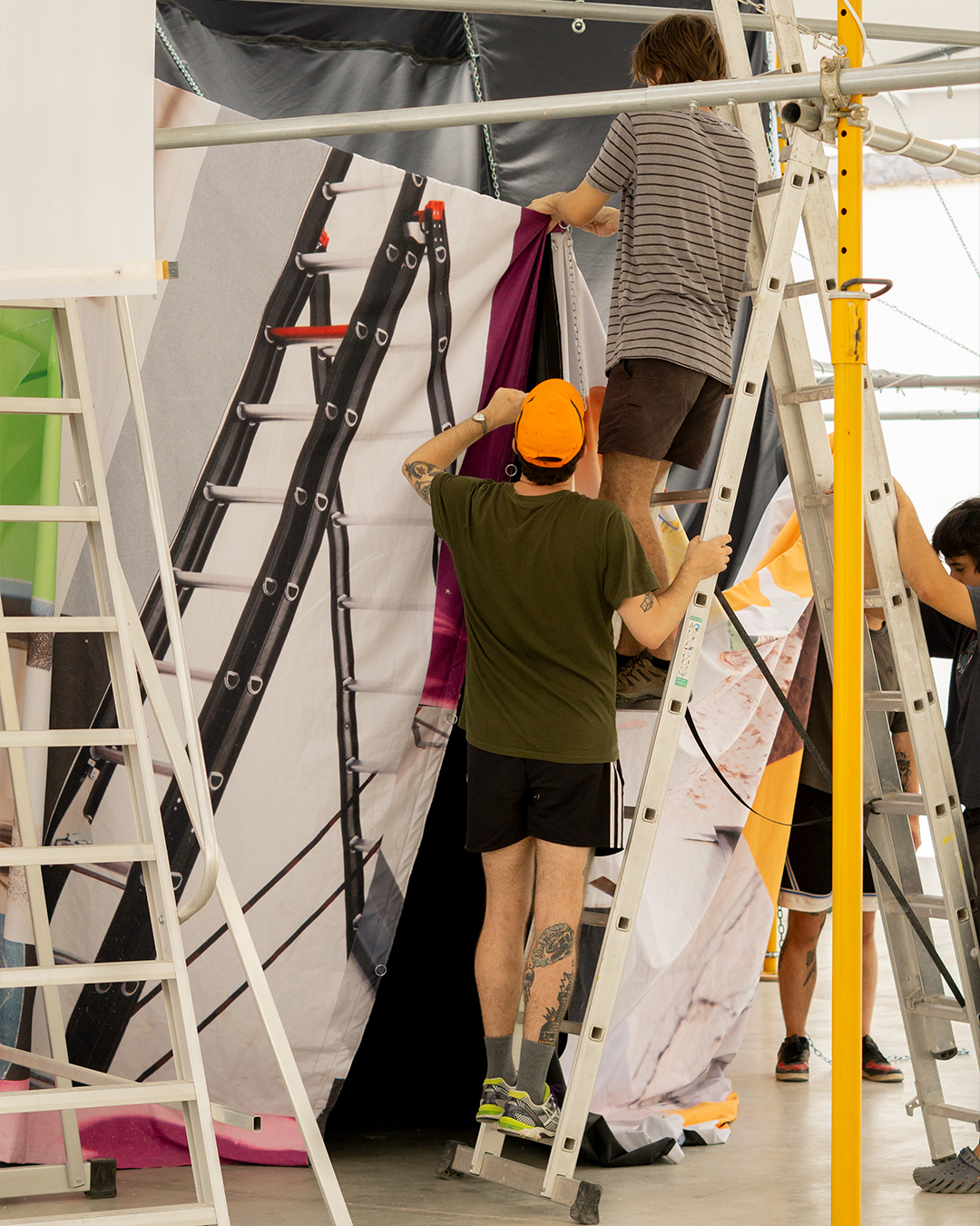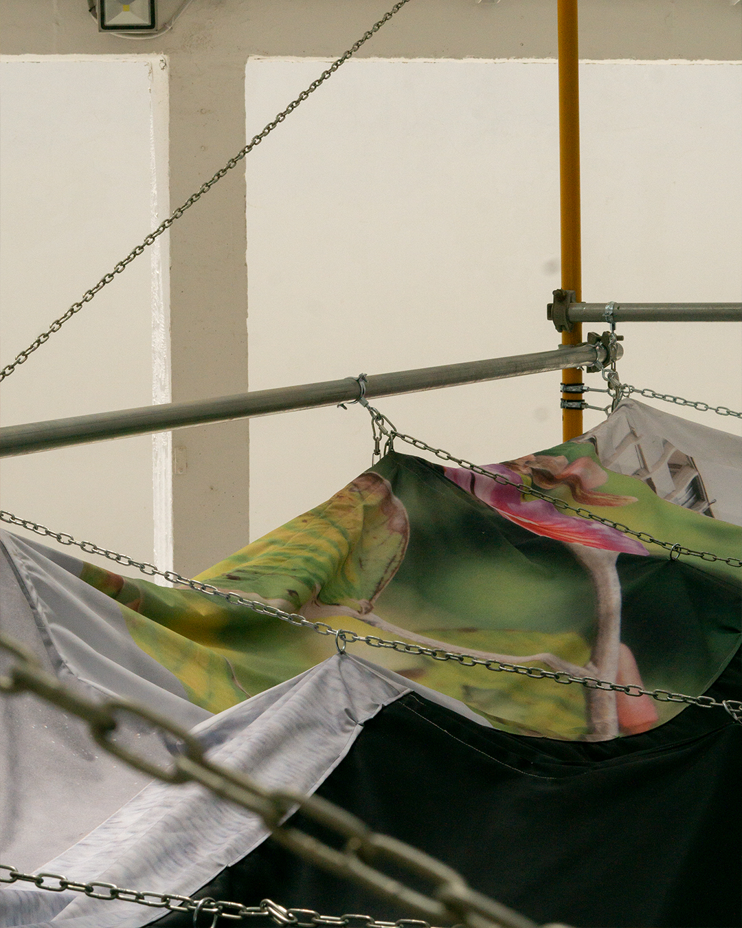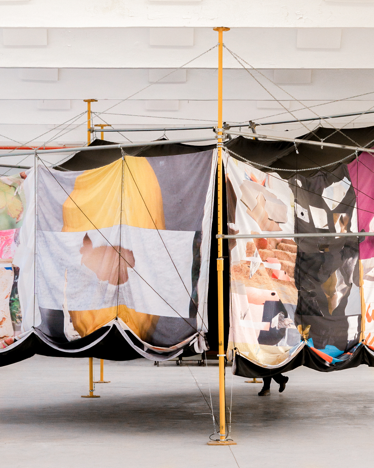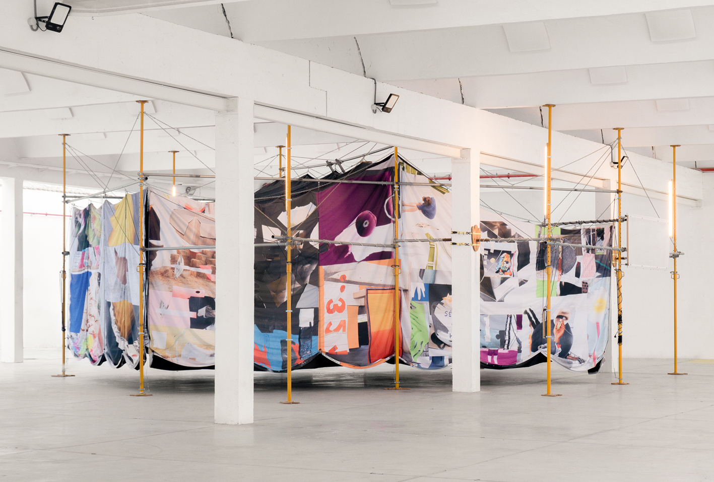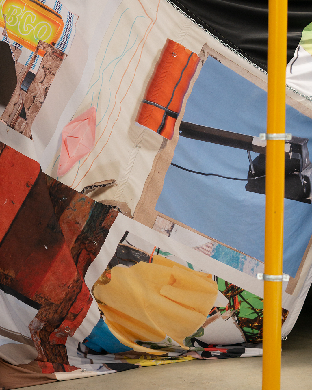 Tela diseñada por Alberto Feijóo a partir de collages producidos durante talleres del programa Estratos.